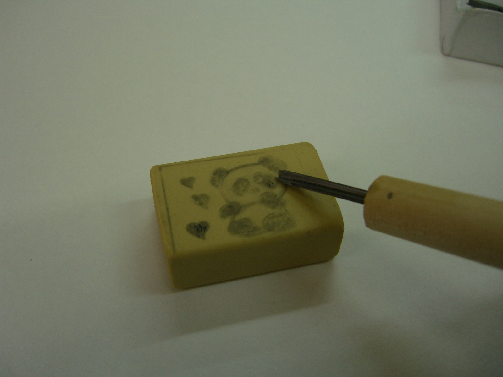 將圖案放在擦膠上,用指甲不停的刮呀...刮... 刮到喇,可惜圖案唔算好出,咁就再用鉛筆加深 d 線條。